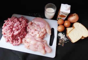 Hachez la chair de poulet restante ainsi que la viande blanche (veiller à ce que les quantités soient équivalente).