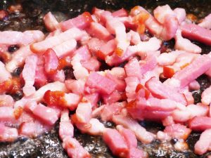Dans une poêle, faire fondre la graisse de canard, faire fondre l’échalote, faire revenir les lardons à légère coloration.